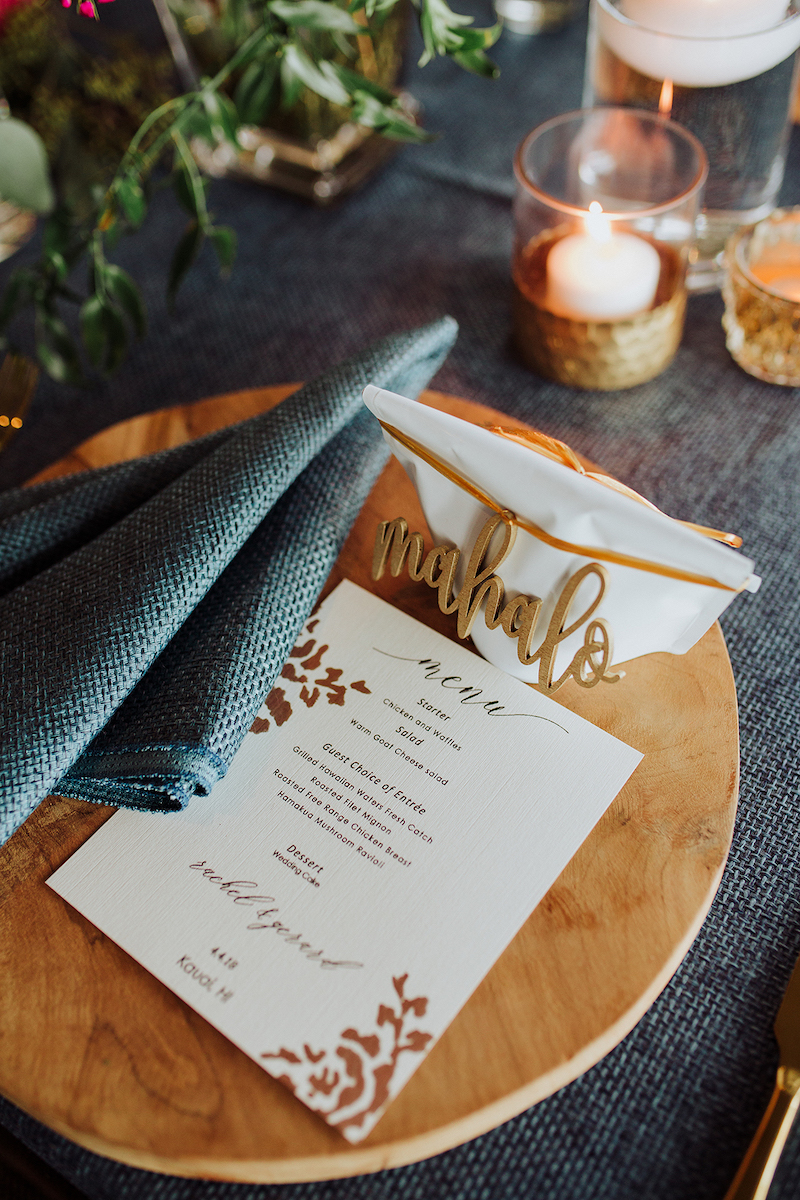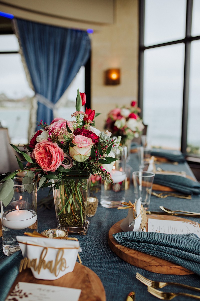 Rachel & Gerard had a vision of florals with hints of nautical notes, such as blue stripes and rope knots. During our calls, Rachel seemed a little unsure of what direction she wanted to go in. She just knew blue was their color. When their pre-wedding visit to Kauai came and they were able to meet and discuss their vision with their vendors, everything changed! Meeting with their florist at their warehouse is where all the magic happened! From a nautical vision to romantic blue slate linens, teak wooden chargers, geo terrarium centerpieces, floating candles, and florals that pulled it all together! This goes to show that having trust in your vendors can make all the difference. Rachel and Gerard opened their minds and hearts to new ideas. What came out of it was a natural, organic, yet elegant vision and it matched their personalities perfectly.
